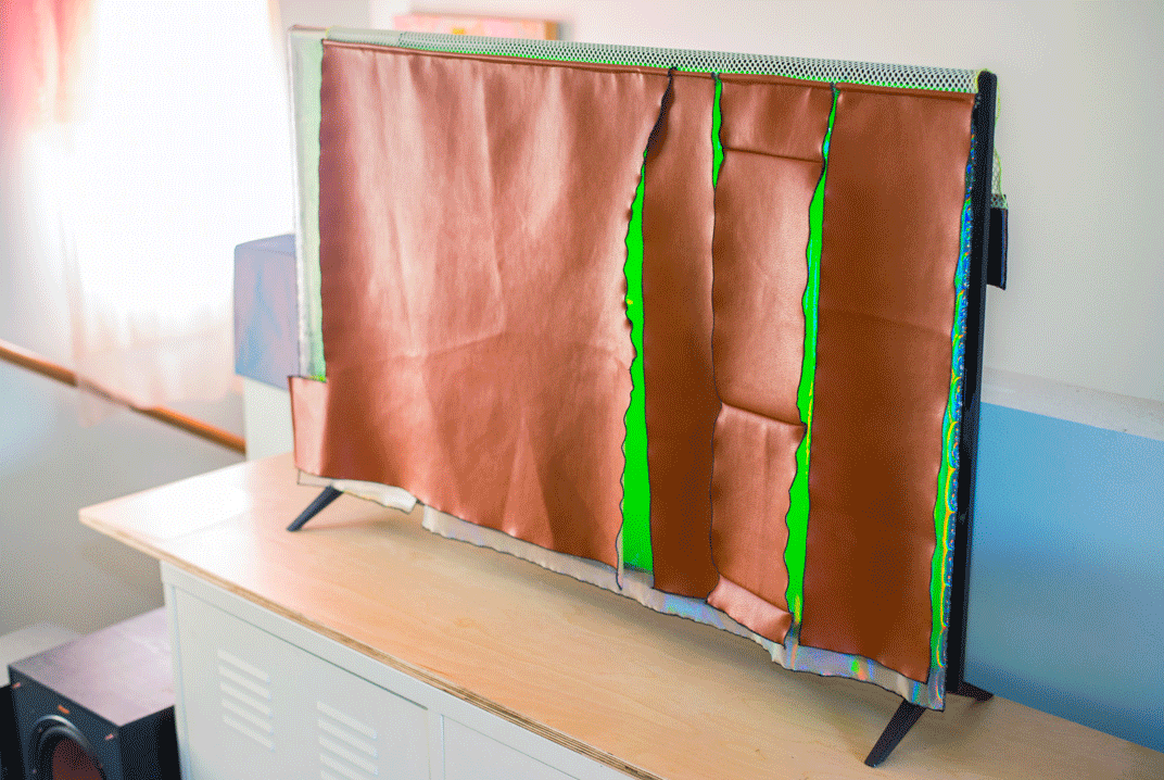 Grown from that lush meadow where minds meld—SJ had been dreaming of making a tv cover for years when a good friend reached out about this project. Using remnants from past projects, we designed and created a cover for tv that has both spectral and opaque qualities. Inspired by those flappy industrial freezer curtains, individual panels allow you to decide just how much screen time airs. Made from remnants (of vinyl + athletic mesh) from past projects, iridescent film, silicon rubber.